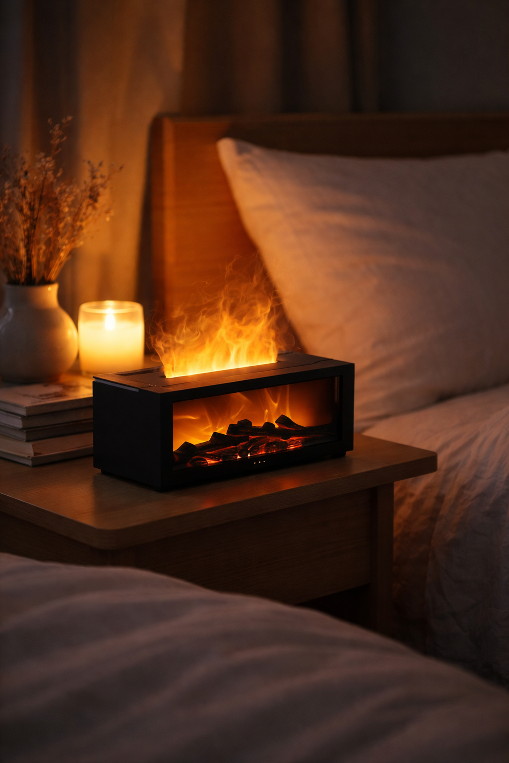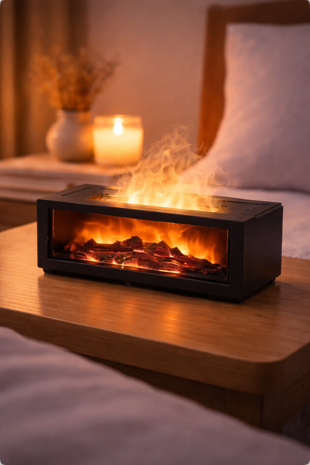 Flameora blends soft flame light and flowing vapor to create a warm, relaxing atmosphere.